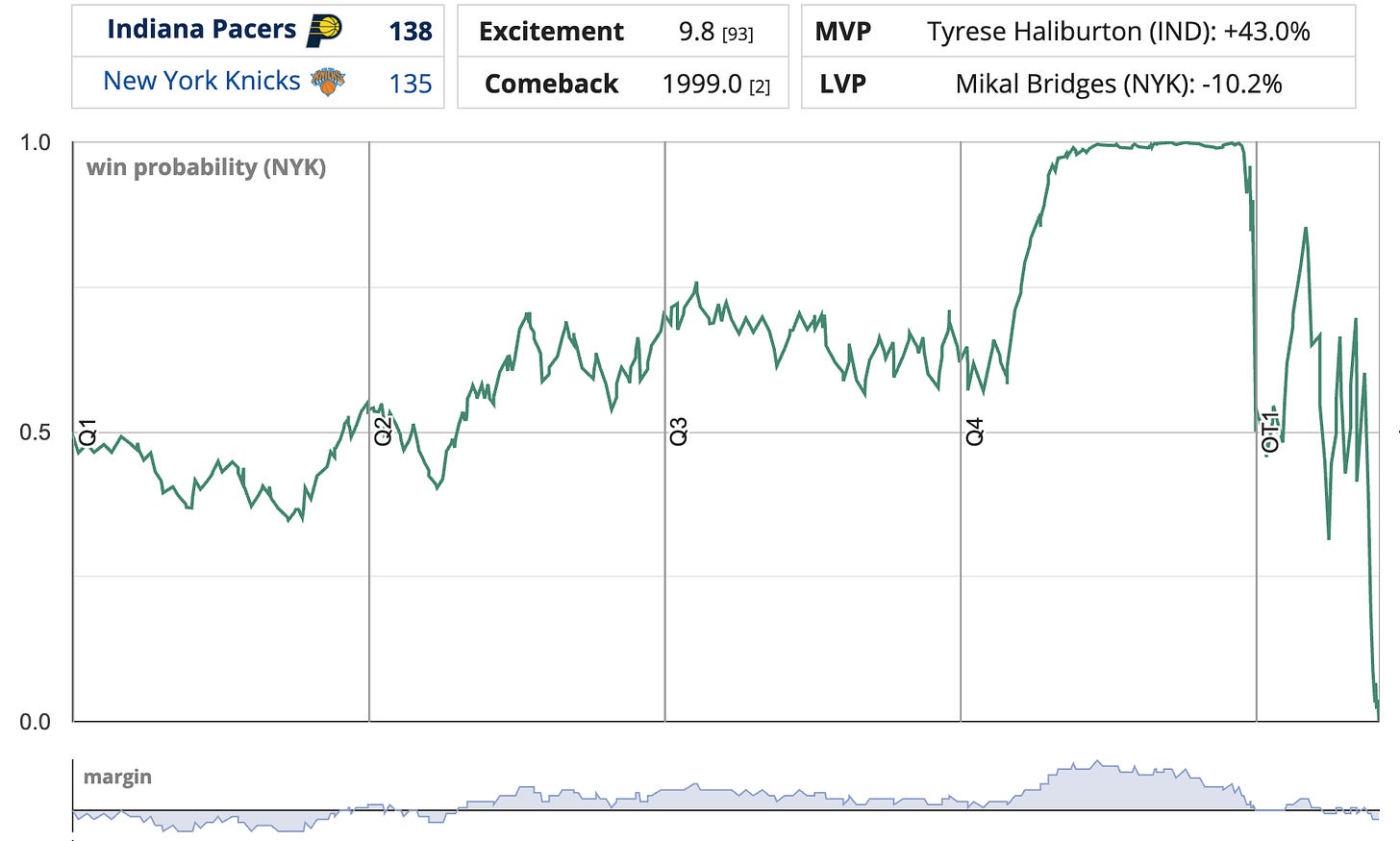 We’ll illustrate with one of the best games of the past decade: The Pacers’ late game comeback against the Knicks in the 2025 Eastern Conference Finals, culminating in an absurd, ballistically improbable overtime-forcing buzzer beater from Tyrese Haliburton: