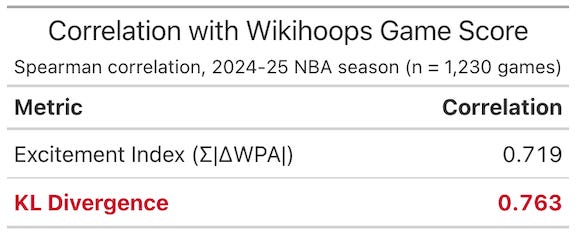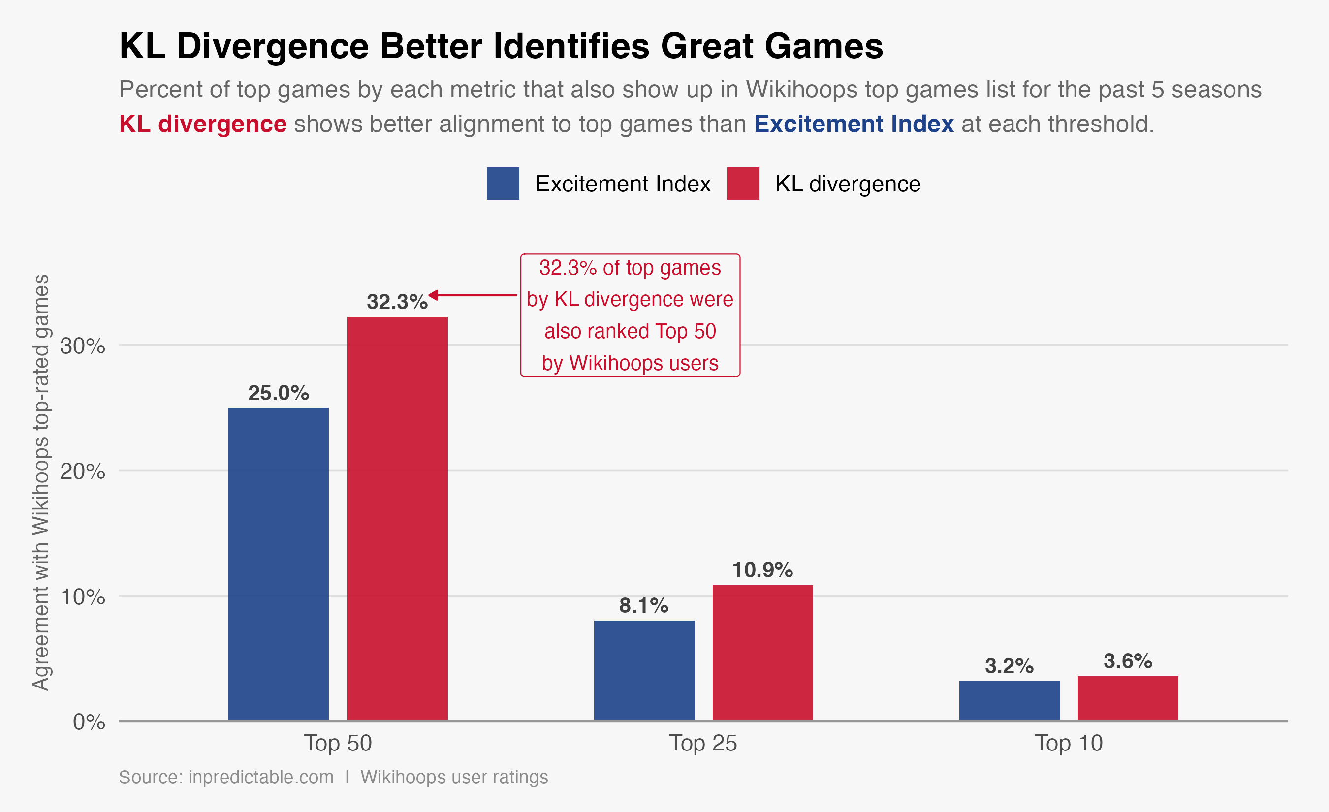 We can also measure how each metric aligns with the top games each season, as ranked by Wikihoops users. Whether by top 50, top 25, or top 10, KL-Divergence rankings have more overlap with Wikihoops user scores than the current version of Excitement Index