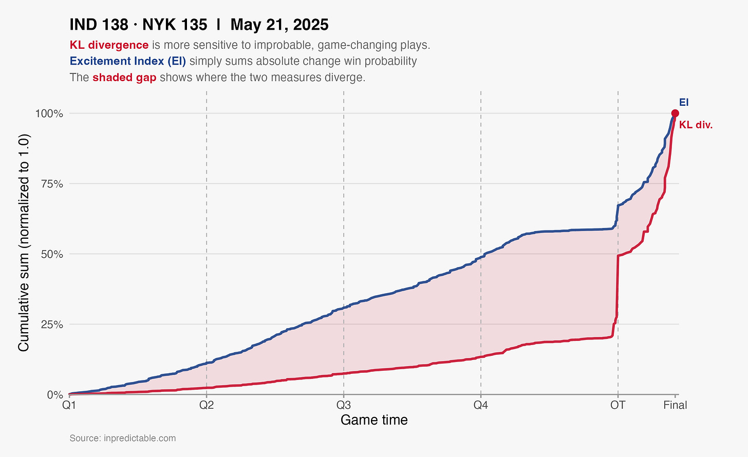 Having established KL-Divergence’s theoretical and practical bonafides, the next step is to deploy it as the new, improved version of Excitement Index on inpredictable for both the NBA and WNBA.